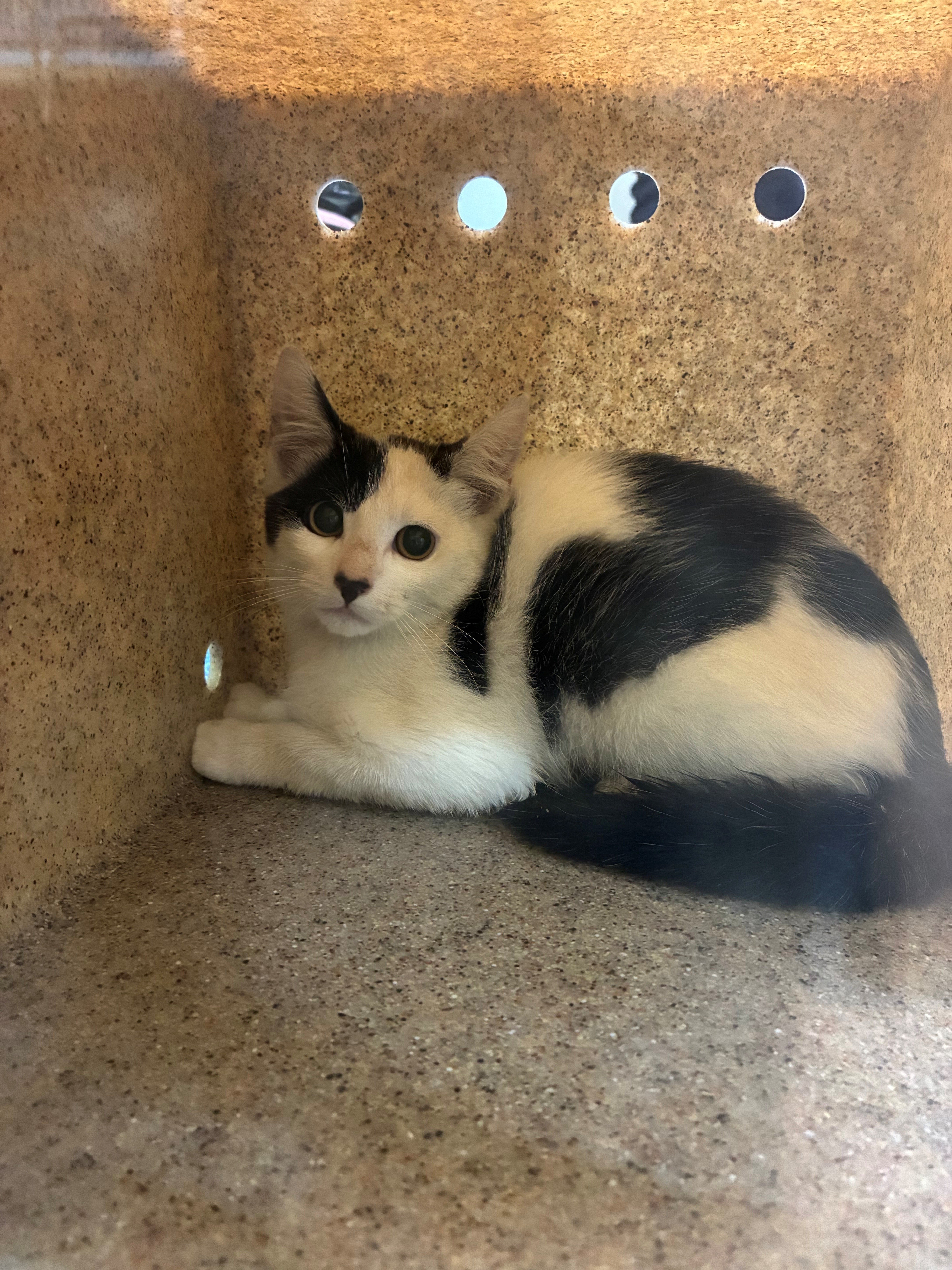 5 months old. Chicky is a kitten with a sweet nature and a soft heart. She came into the shelter very scared, but once she realised, she was safe, her true personality blossomed. She’s looking for a quiet, relaxed home where she can feel secure and continue to grow in confidence. Once she trusts you, Chicky is incredibly loving — she enjoys cuddles, pats, and will happily purr the day away.